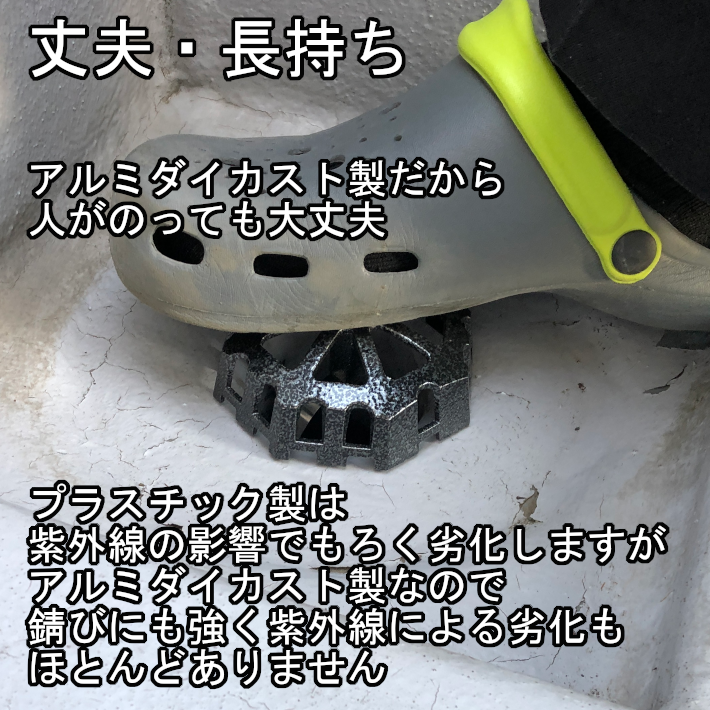 今月は、弊社ストレーナーの丈夫さについて説明させていただきます。弊社のストレーナーは、錆びにくいアルミダイカストでできているため、プラスチックとは違い、紫外線による劣化が少なく、また強度が強いため、踏んだり、つまづいても壊れにくくなっております。つまり、イワタドレンストレーナーは丈夫で長持ちです!感動しますよ!